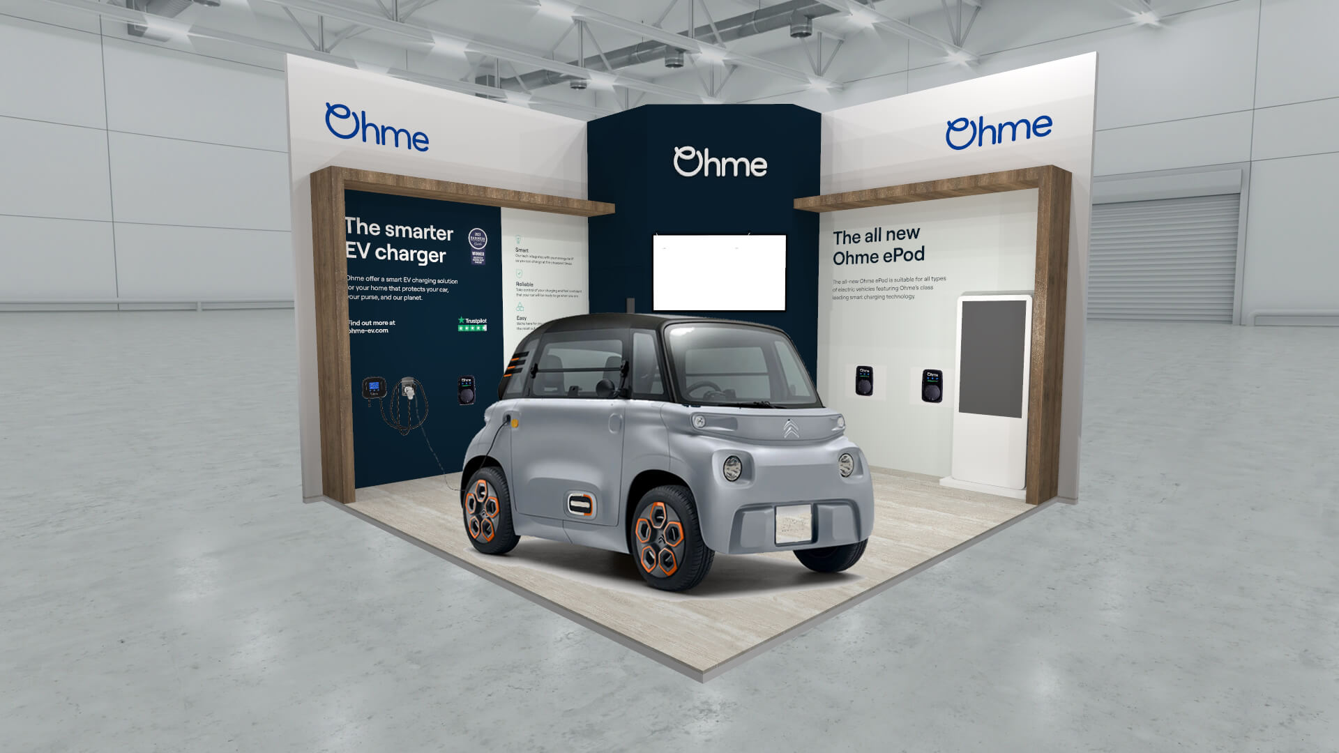 The central focus of the stand was to be a Citroen Ami, helping to demonstrate and promote existing charger models, plus the newly launched Ohme ePod smart EV charger. Ohme required room for a free-standing display screen and plenty of wall space to display the chargers whilst also allowing open space for conversation with potential clients.